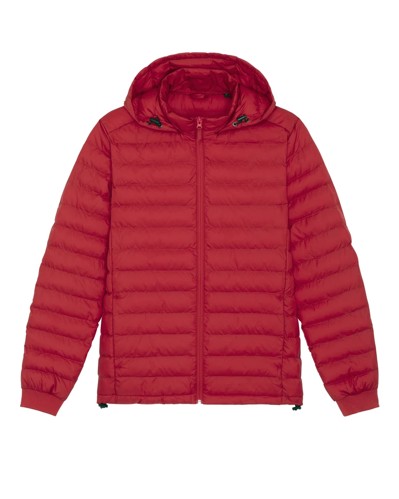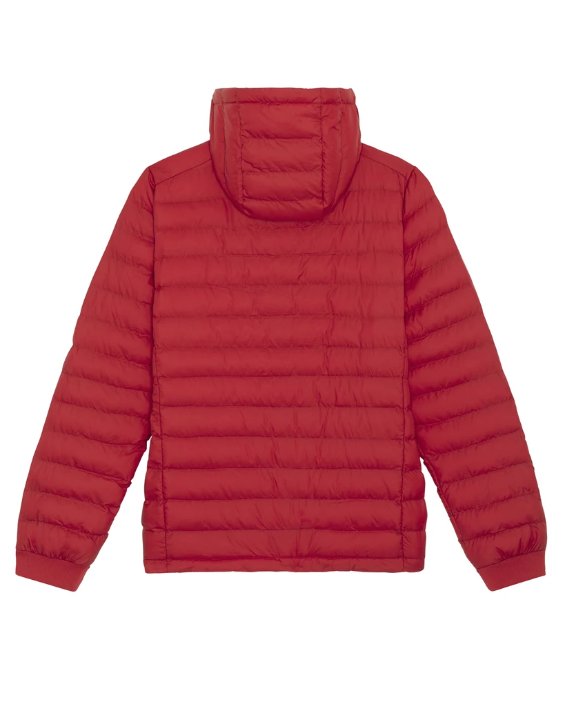 Material: 100% Recycled polyester, Fluorine-free DWR; Weight: 75gsm; Fitted cut, set-in sleeve, high collar with detachable hood and matte metal hidden snaps, hood opening and bottom hem with adjustable plastic stopper and elastic cord, reverse nylon zip at center front, zipped welt pockets with extra grosgrain puller, fully quilted, side panels for better shape, 1x1 rib at sleeve hem, inside bound seams; Certificates: Global Recycled Standard (GRS), Fair Wair, STANDARD 100 by OEKO-TEX®, Peta - Approved VEGAN