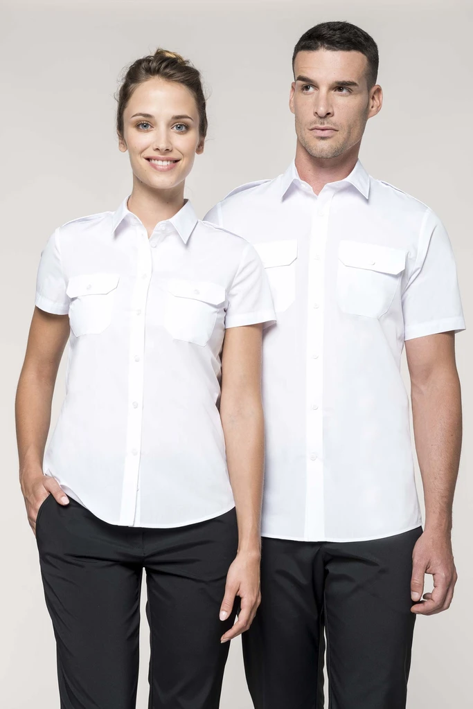 65 % polyester/35 % cotton poplin. Easy care. Matching buttons. 2 flap chest pockets including 1 with pen holder on left side. Back pleats. Buttoned placket on shoulders for attaching braids (braids not included). Turn-up finishing at cuffs.