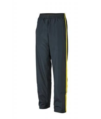 Light-weight fabric, wind- and water-repellent, breathable, Full-length mesh lining, Lateral contrasting stripes, 2 zipped pockets, Elastic waistband with cord, Zipped leg gathers, Reflective transfer