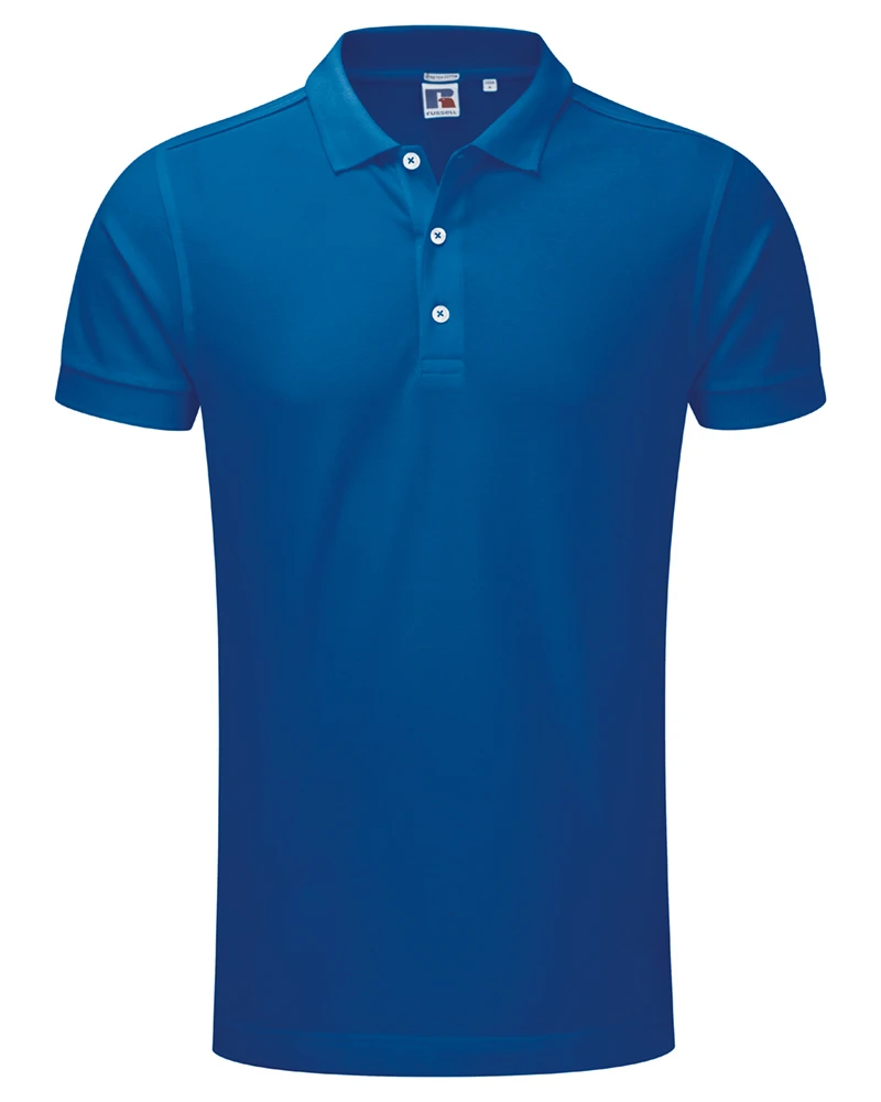 Weight: 210gsm (White: 205gsm); Material: 95% Combed Ringspun Cotton; 5% LYCRA®; *Light Oxford: 88% Combed Ringspun Cotton, 7% Viscose, 5% LYCRA®; Long slim fit, fine honeycomb pique structure, slim leaf collar, contrast buttons, ribbed cuffs, strip of self-colour fabric along shoulder seam, shorter side vents with herringbone tape, soft handfeel, Russell’s best looking polo ever will turn heads; Certificates: STANDARD 100 by OEKO-TEX®; WRAP