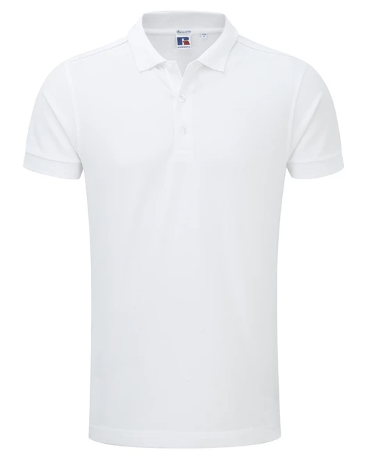 Weight: 210gsm (White: 205gsm); Material: 95% Combed Ringspun Cotton; 5% LYCRA®; *Light Oxford: 88% Combed Ringspun Cotton, 7% Viscose, 5% LYCRA®; Long slim fit, fine honeycomb pique structure, slim leaf collar, contrast buttons, ribbed cuffs, strip of self-colour fabric along shoulder seam, shorter side vents with herringbone tape, soft handfeel, Russell’s best looking polo ever will turn heads; Certificates: STANDARD 100 by OEKO-TEX®; WRAP