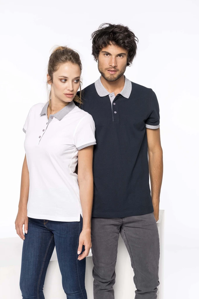 100 % pre-shrunk cotton piqué (Oxford Grey: 90 % cotton/10 % viscose). Contrasting rib at neck and cuffs. Contrasting taped neck. Contrasting inner placket with 3 buttons. Twin needle finishing at hem. No brand label at neck, only size tag for easy relabelling.