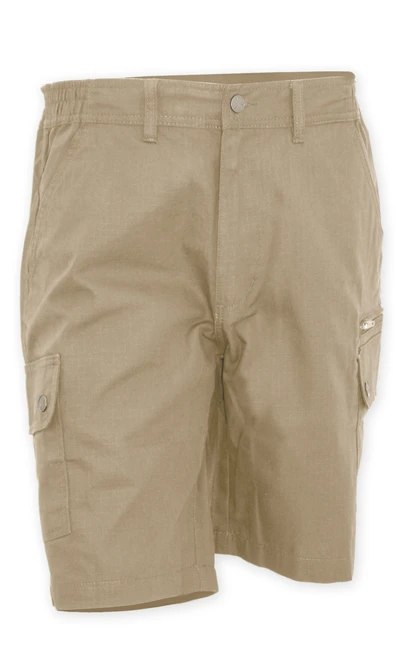 Bermuda shorts with side elastic and waist belt loops, zip fastening with button, two classic front pockets, two large side pockets with flaps and snap fasteners, one left secur zip pocket, one foldaway tape measure pocket on the right, two slit back pockets with button and buttonhole