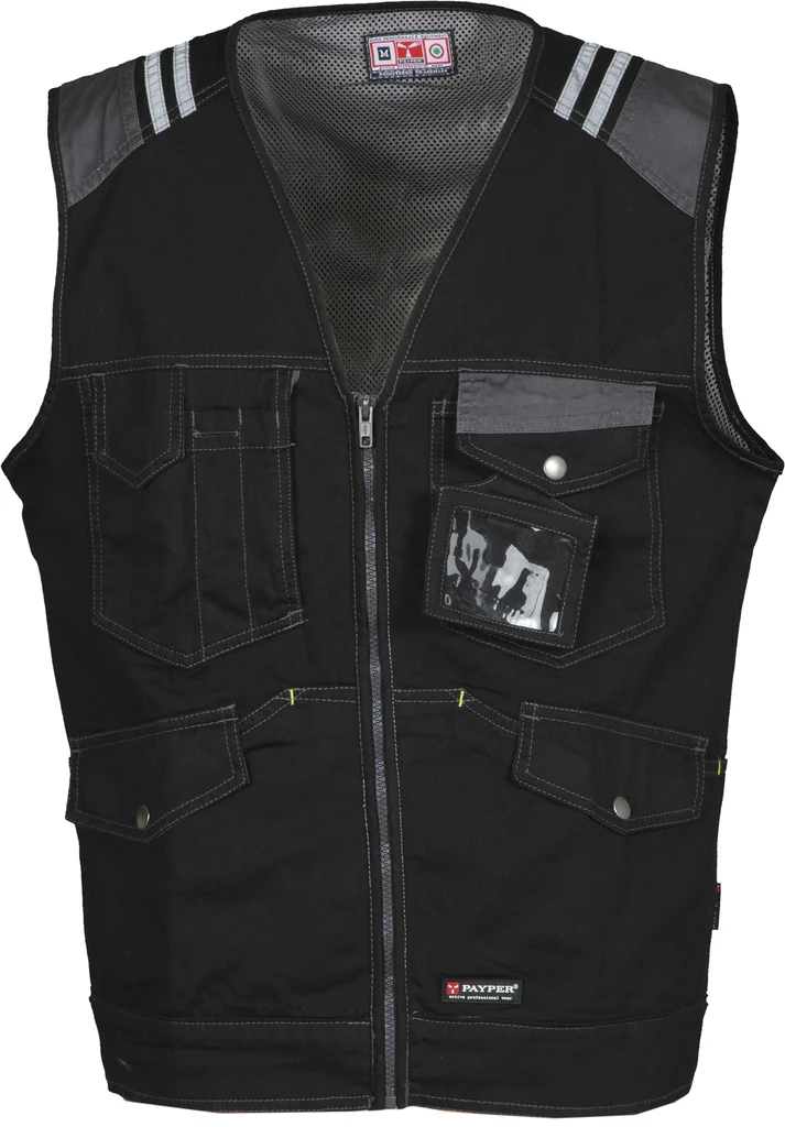 Men’s contrasting two-tone vest, jeans-type fitted cut, front fastening with zip, front zip fastener, two front kangaroo pockets with LOCK SYSTEM closing flap and metal button, two chest pockets, one with LOCK SYSTEM, detachable, foldaway badge holder, mobile phone holder; reflective piping on the back; reflective bands on the shoulder for greater safety and visibility; dry-tech lining.