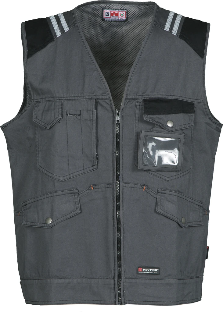 Men’s contrasting two-tone vest, jeans-type fitted cut, front fastening with zip, front zip fastener, two front kangaroo pockets with LOCK SYSTEM closing flap and metal button, two chest pockets, one with LOCK SYSTEM, detachable, foldaway badge holder, mobile phone holder; reflective piping on the back; reflective bands on the shoulder for greater safety and visibility; dry-tech lining.