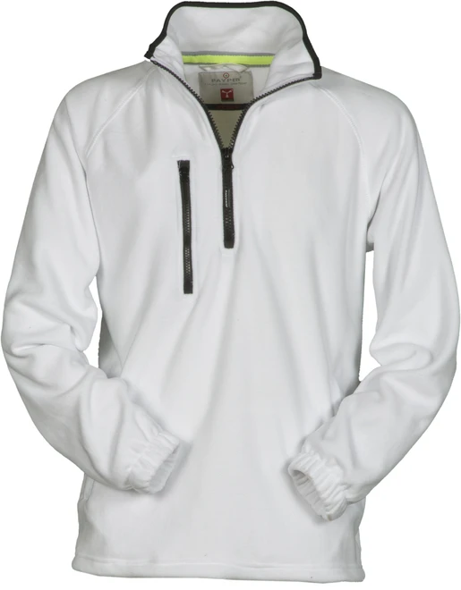 Fleece, with black plastic 8 mm half zip, raglan sleeves, adjustable drawstring at the waist, elasticated cuffs, two pockets with concealed zip, one front zip pocket, neck with contrasting reinforcement tape, reinforced seams