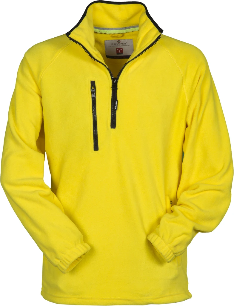 Fleece, with black plastic 8 mm half zip, raglan sleeves, adjustable drawstring at the waist, elasticated cuffs, two pockets with concealed zip, one front zip pocket, neck with contrasting reinforcement tape, reinforced seams