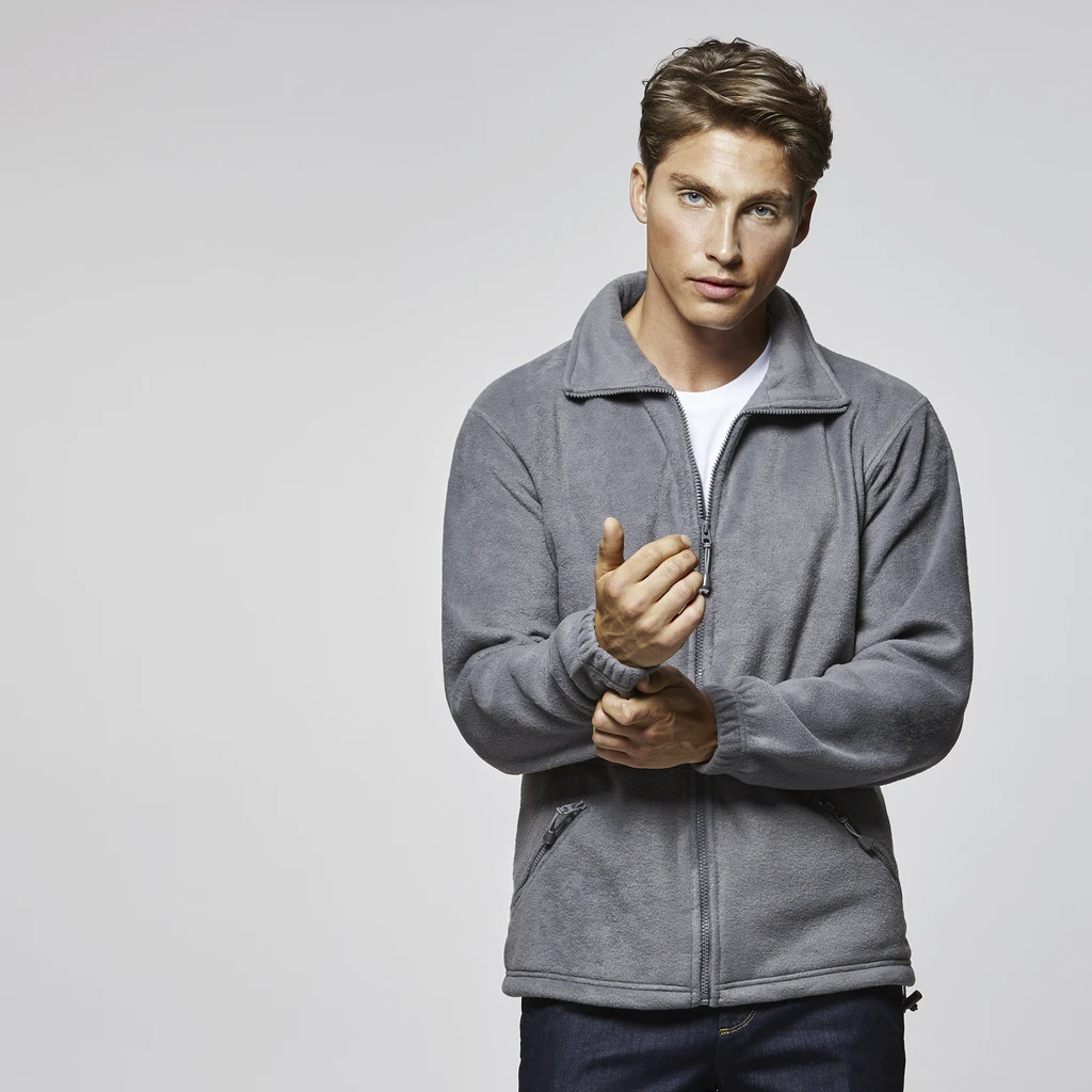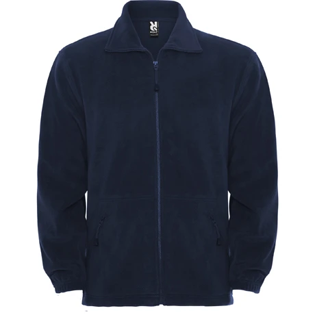 Fleece jacket, with high necked lined collar and matching full zipper. Side pocket with zipper, elastic cuffs and waist with side adjusters.