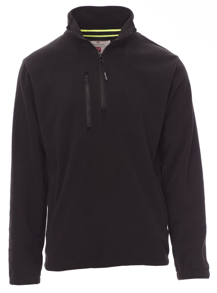 Fleece, with black plastic half zip, raglan sleeves, elasticated cuffs and waist, two pockets with concealed zip, one front zip pocket, neck with contrasting reinforcement tape, reinforced