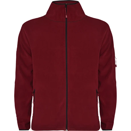 Fleeced jacket for outdoor sports, with high neck and long sleeve ribbed to contrast. Pocket with zip in left sleeve and front zip, both in contrast. Seams in side and chest. Elbow pads in same fabric.