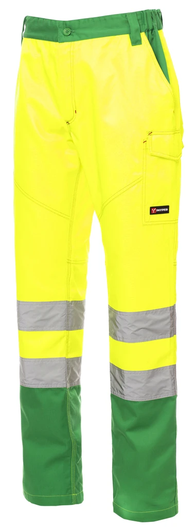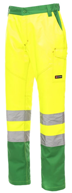 Men’s high visibility, two-tone all-season trousers with reflective stripes, side elastic and waist belt loops. Zip fastening with plastic button, two classic front pockets, one LOCK SYSTEM side pocket, a tape measure pocket, two back pockets, one open and one with flap and Velcro. Contrasting stitching, triple seam crotch and inner leg