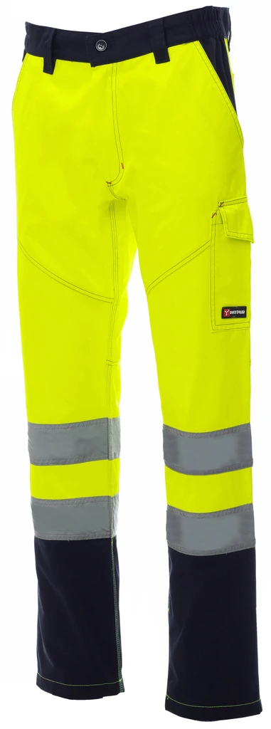 Men’s high visibility, two-tone all-season trousers with reflective stripes, side elastic and waist belt loops. Zip fastening with plastic button, two classic front pockets, one LOCK SYSTEM side pocket, a tape measure pocket, two back pockets, one open and one with flap and Velcro. Contrasting stitching, triple seam crotch and inner leg