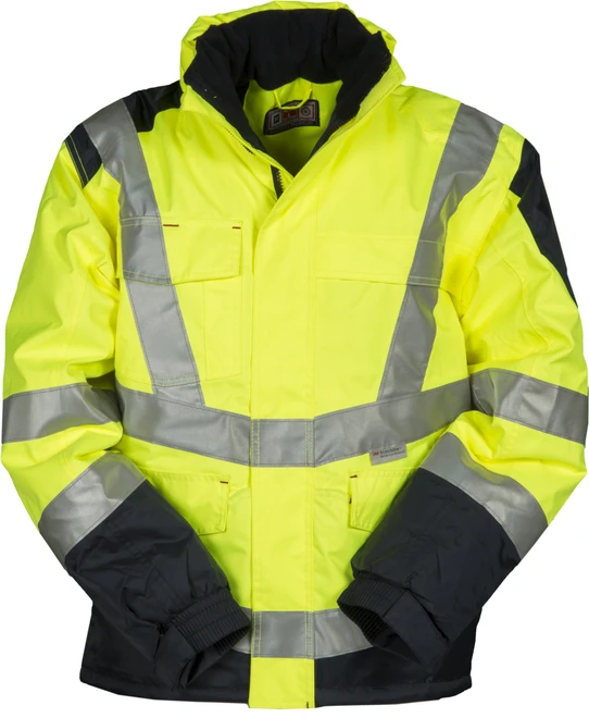 Men’s two-tone, high-visibility jacket with 3M stripes, plastic zip with metal pull with flap and Velcro, foldaway and/or detachable hood with drawstring, elasticated waist, adjustable cuffs, four roomy front pockets, two with zip, one breast pocket with pen holder and foldaway badge holder and one pocket with concealed zip. Padded, fleece inside collar and shoulders, inner pocket, heat taped seams