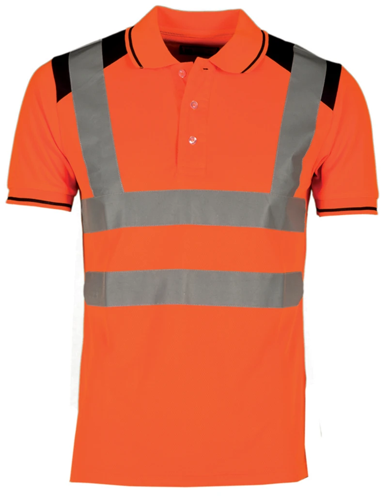 Men’s short-sleeved two-tone, high-visibility polo shirt with reflective stripes, with three, matching, mother-of-pearl effect buttons, contrasting fine rib collar and sleeve edging, side vents, concealed collar stitching