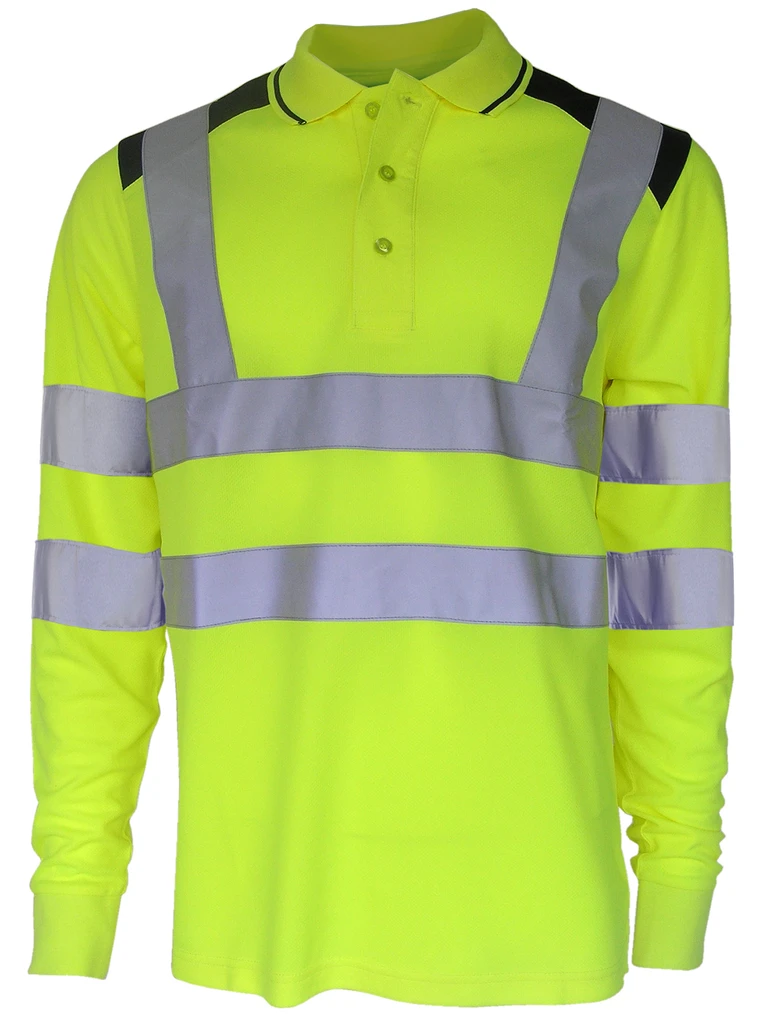 Men’s long-sleeved two-tone, high-visibility polo shirt with reflective stripes, with three, matching, mother-of-pearl effect buttons, contrasting fine rib collar and sleeve edging, side vents, concealed collar stitching