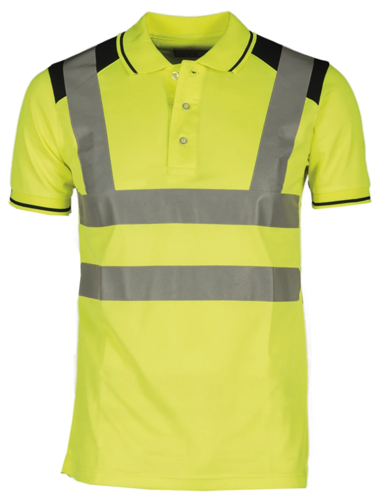 Men’s short-sleeved two-tone, high-visibility polo shirt with reflective stripes, with three, matching, mother-of-pearl effect buttons, contrasting fine rib collar and sleeve edging, side vents, concealed collar stitching