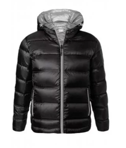 Hooded down jacket in new design, Back-stitching of the jacket is taped, not sewn
