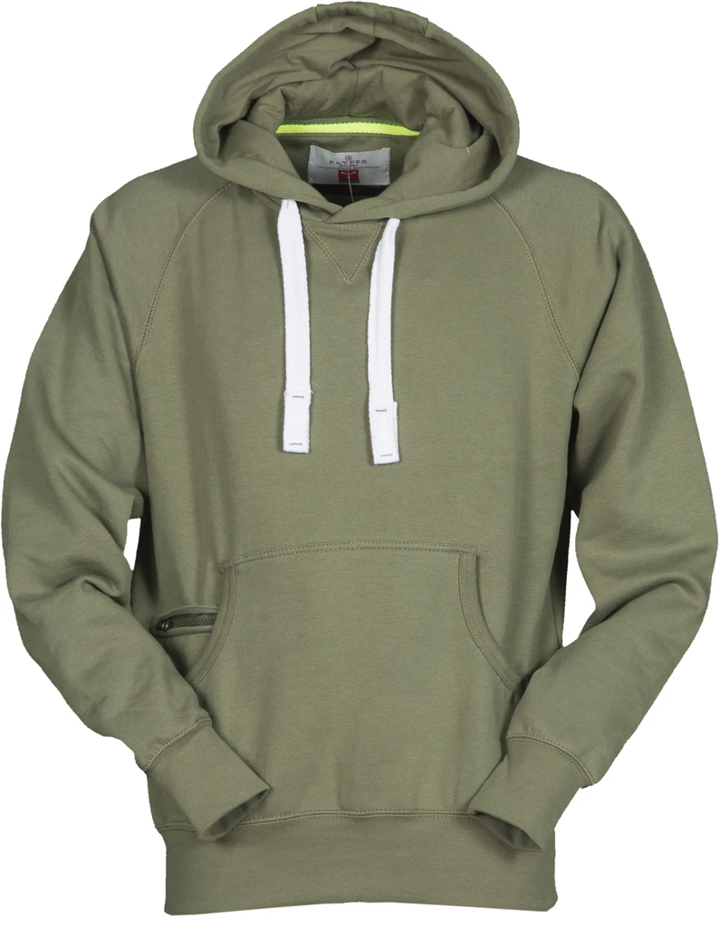 Men’s hoodie with double stitched seams and white drawstring with contrasting stitching and metal rings, raglan sleeves, V-design neck stitching, kangaroo pockets, small zip pocket, stretch rib cuffs and hem, reinforced seams