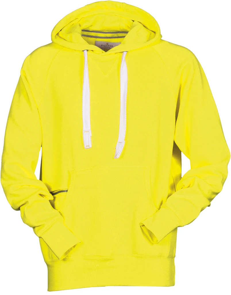 Men’s hoodie with double stitched seams and white drawstring with contrasting stitching and metal rings, raglan sleeves, V-design neck stitching, kangaroo pockets, small zip pocket, stretch rib cuffs and hem, reinforced seams