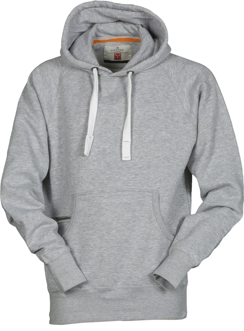 Men’s hoodie with double stitched seams and white drawstring with contrasting stitching and metal rings, raglan sleeves, V-design neck stitching, kangaroo pockets, small zip pocket, stretch rib cuffs and hem, reinforced seams