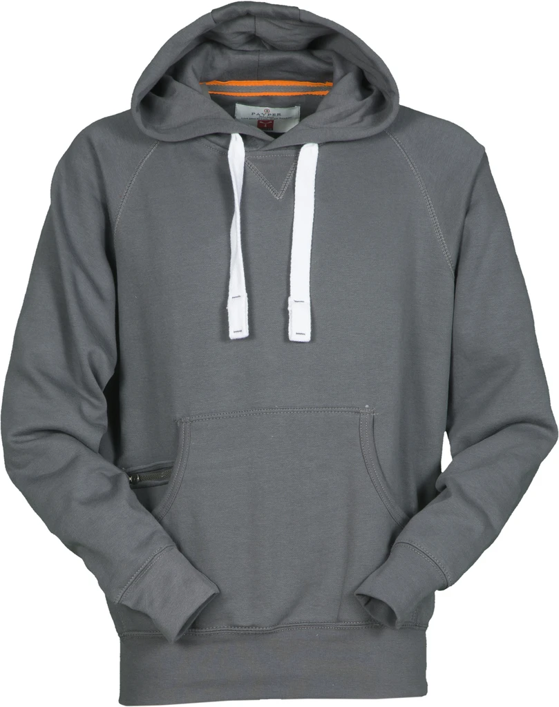 Men’s hoodie with double stitched seams and white drawstring with contrasting stitching and metal rings, raglan sleeves, V-design neck stitching, kangaroo pockets, small zip pocket, stretch rib cuffs and hem, reinforced seams