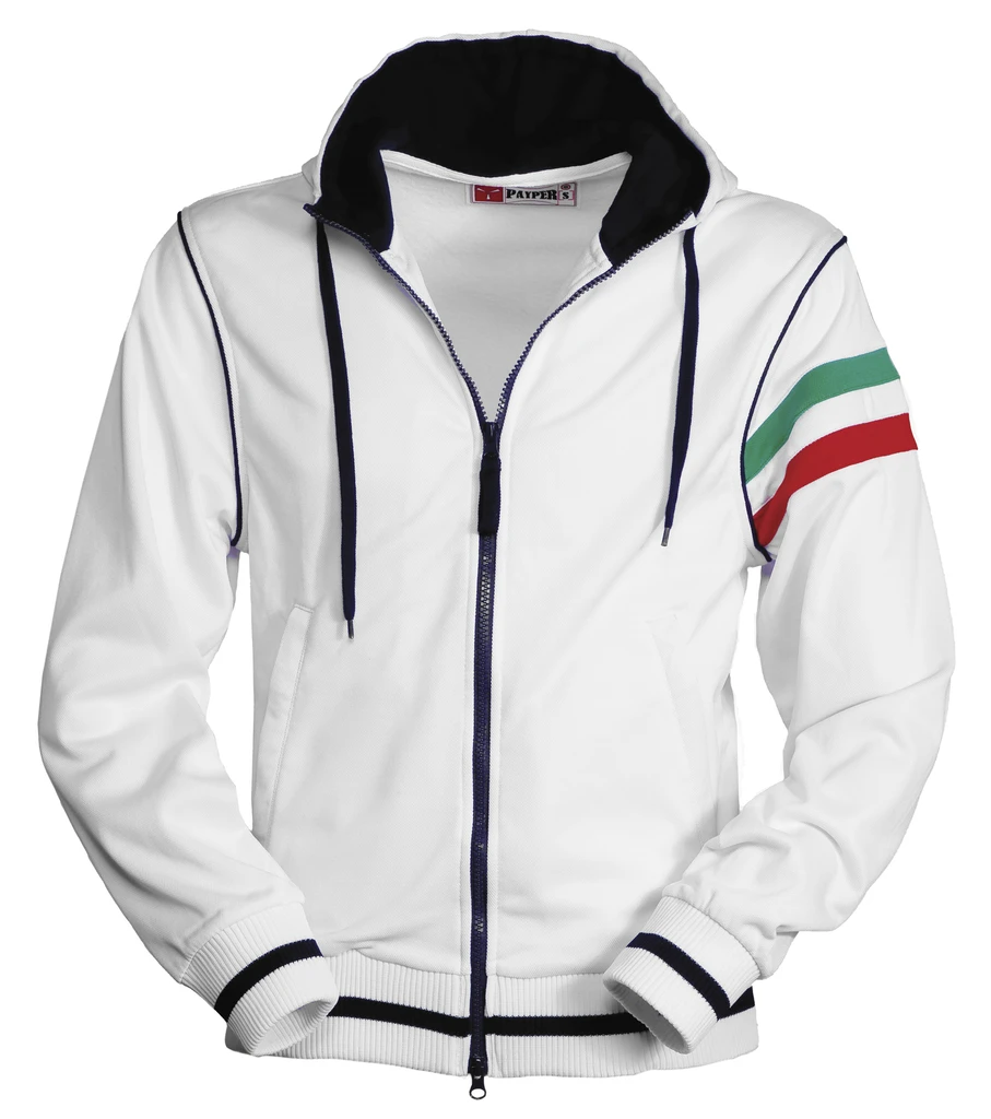 Men’s hoodie with full, contrasting plastic zip with double metal pull. Contrasting hood and drawstring, contrasting stretch rib cuffs and hem, contrasting cuff piping, trim (colours of the flag) on the left sleeve, 2 pockets with zip, reinforced seams and pique type fabric for greater breathability