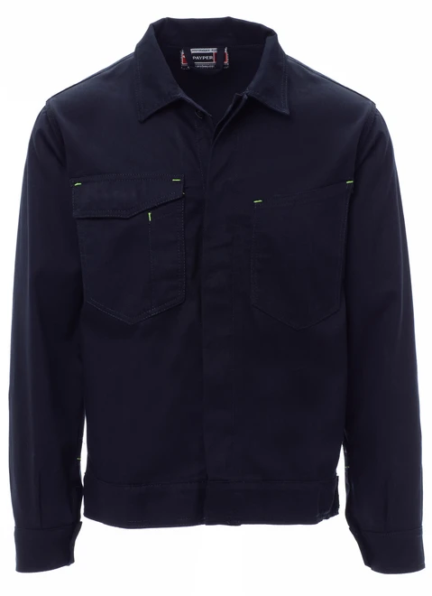 Jeans-style fitted lightweight jacket, front fastening with concealed plastic buttons. Two chest pockets of which one with smartphone holder, badge holder, pen holder and Velcro flap closure. Wrist closure with button and adjustable hem with Velcro