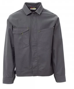 Jeans-style fitted lightweight jacket, front fastening with concealed plastic buttons. Two chest pockets of which one with smartphone holder, badge holder, pen holder and Velcro flap closure. Wrist closure with button and adjustable hem with Velcro