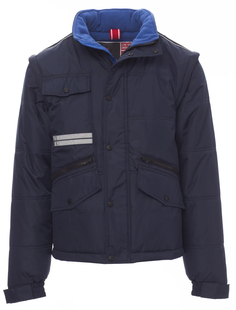 Men’s lightweight jacket with detachable sleeves, 8 mm plastic zip with metal pull, with flap fastening and plastic buttons, contoured back, two LOCK SYSTEM outer pockets, two pockets with zip, slanting pockets for easier access, one smartphone breast pocket and badge holder ring, reflective stripes on the pocket and back. Padded, contrasting fleece lining on the back and collar, one pocket, inner zip for easier printing and embroidery