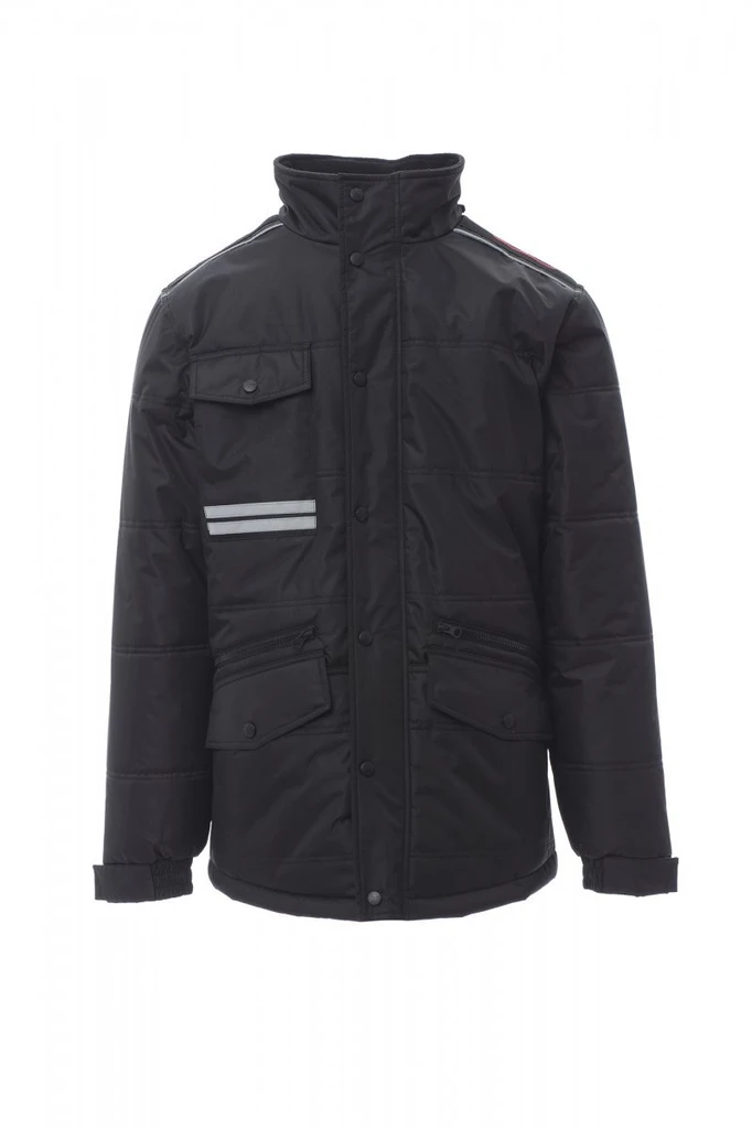 3/4 length men's jacket, 8 mm plastic zip with metal pull, with flap fastening and plastic buttons, contoured back and foldable hood in the collar, two LOCK SYSTEM outer pockets, two pockets with zip, slanting pockets for easier access, one smartphone holder breast pocket and badge holder ring, reflective stripes on the pocket and back. Inside: padded, contrasting fleece lining on the back and collar, one pocket, inner zip for easier printing and embroidery