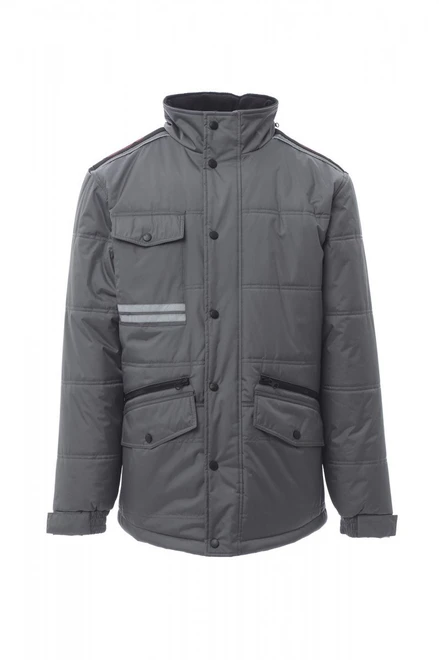 3/4 length men's jacket, 8 mm plastic zip with metal pull, with flap fastening and plastic buttons, contoured back and foldable hood in the collar, two LOCK SYSTEM outer pockets, two pockets with zip, slanting pockets for easier access, one smartphone holder breast pocket and badge holder ring, reflective stripes on the pocket and back. Inside: padded, contrasting fleece lining on the back and collar, one pocket, inner zip for easier printing and embroidery