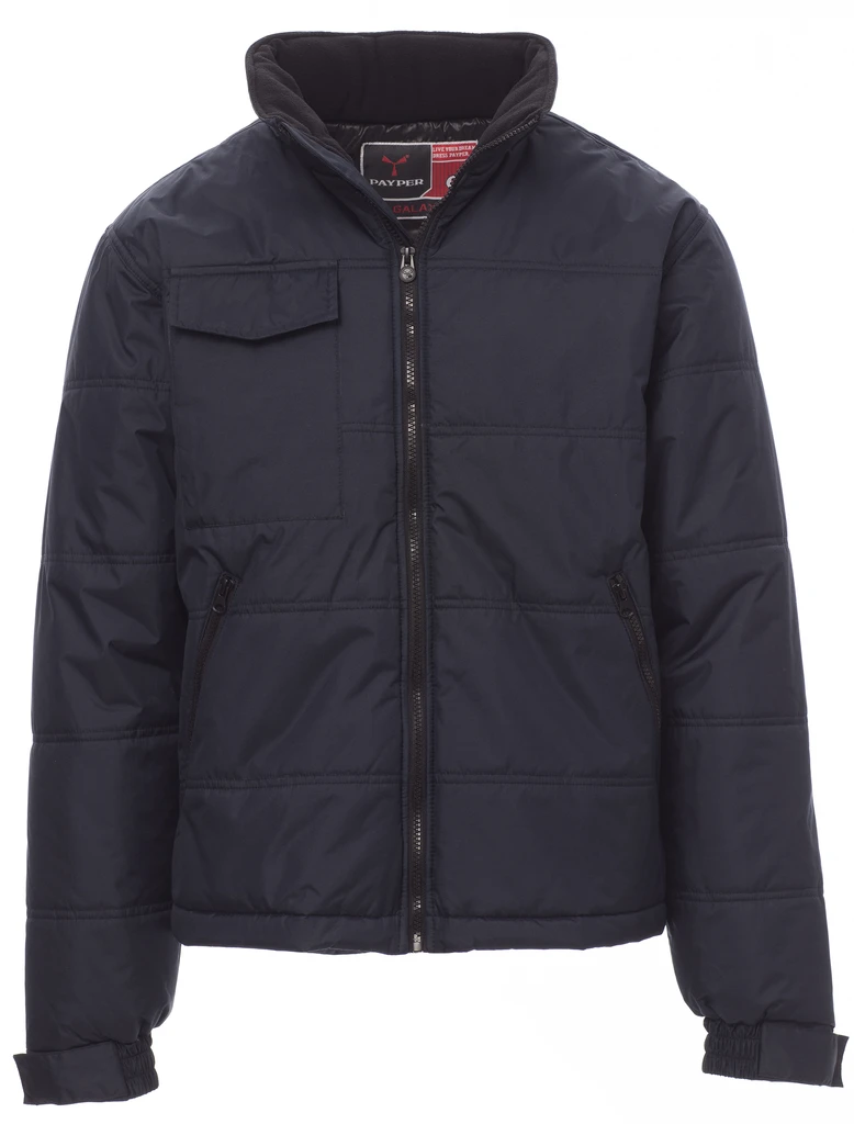 Light jacket with contoured back and padding, finished with high density lining, inner fleece collar. Two large pockets with zip, smartphone breast pocket and one inner pocket, foldaway hood