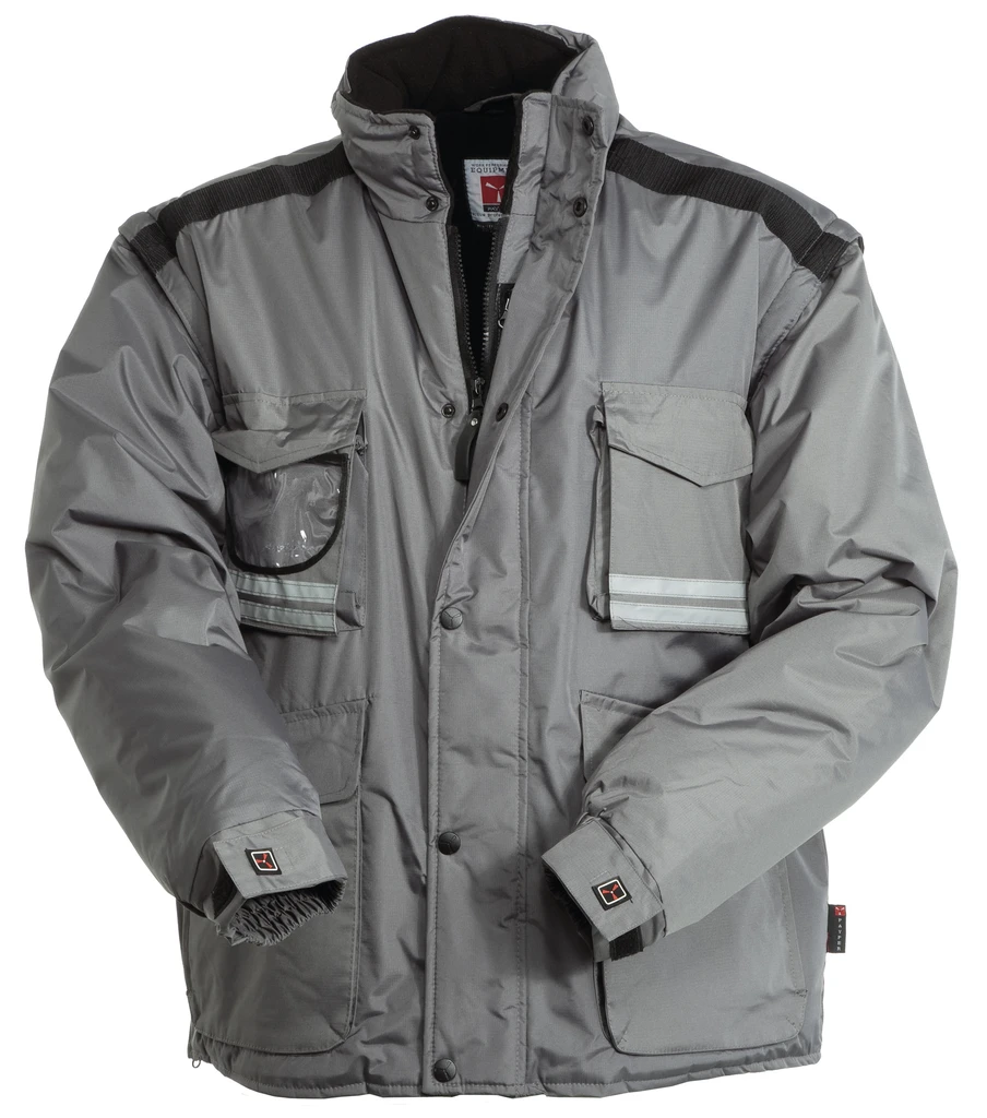 Men’s jacket with detachable sleeves, 8 mm plastic zip with metal pull, with flap fastening and plastic buttons, foldaway hood, adjustable cuffs, matching reflective stripes on the front and back, side vent with gusset and zip. Five outer pockets, one with a reversible badge holder. Padded, collar, back and lower back warmer in micro-fleece, breathable underarm inserts, inner drawstring and zip for easier printing and embroidery