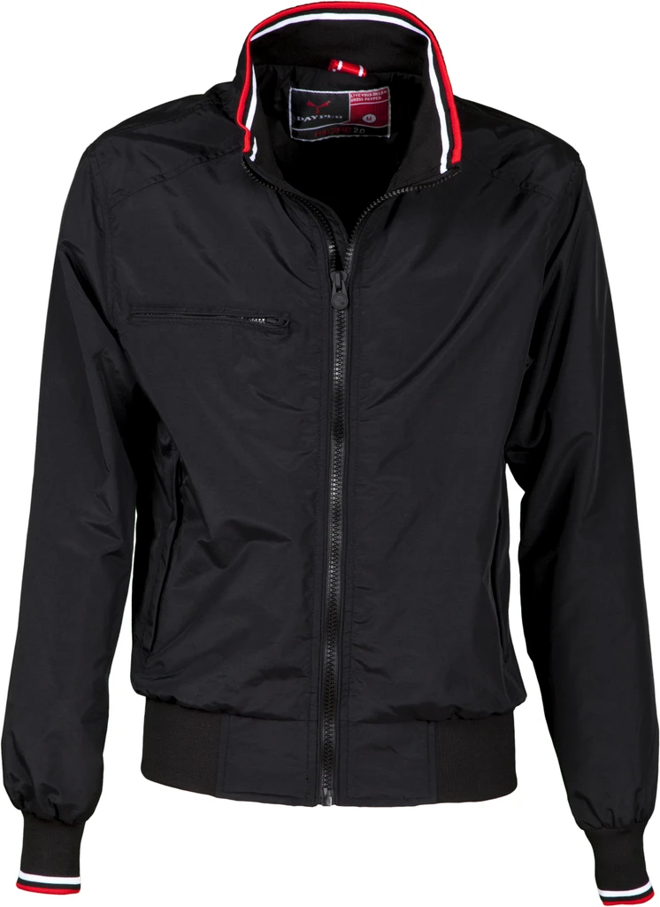 Men’s lightweight jacket, 8 mm plastic zip with metal pull, with collar, cuffs and hem in elastic rib with stripes, two outer pockets with plastic zip. Unpadded, mesh lining, one inner smartphone pocket with zip and opening for headphones, zip on the chest and back for easier printing and embroidery