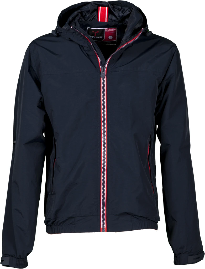 Men’s lightweight jacket with 8 mm contrasting zip, shaped hood with two seams and drawstring, elasticated waist, elasticated and adjustable cuffs, two outer pockets with concealed zip. Unpadded, mesh lining, one inner zip pocket with opening for smartphone headphones, zip on the back and chest for easier printing and embroidery