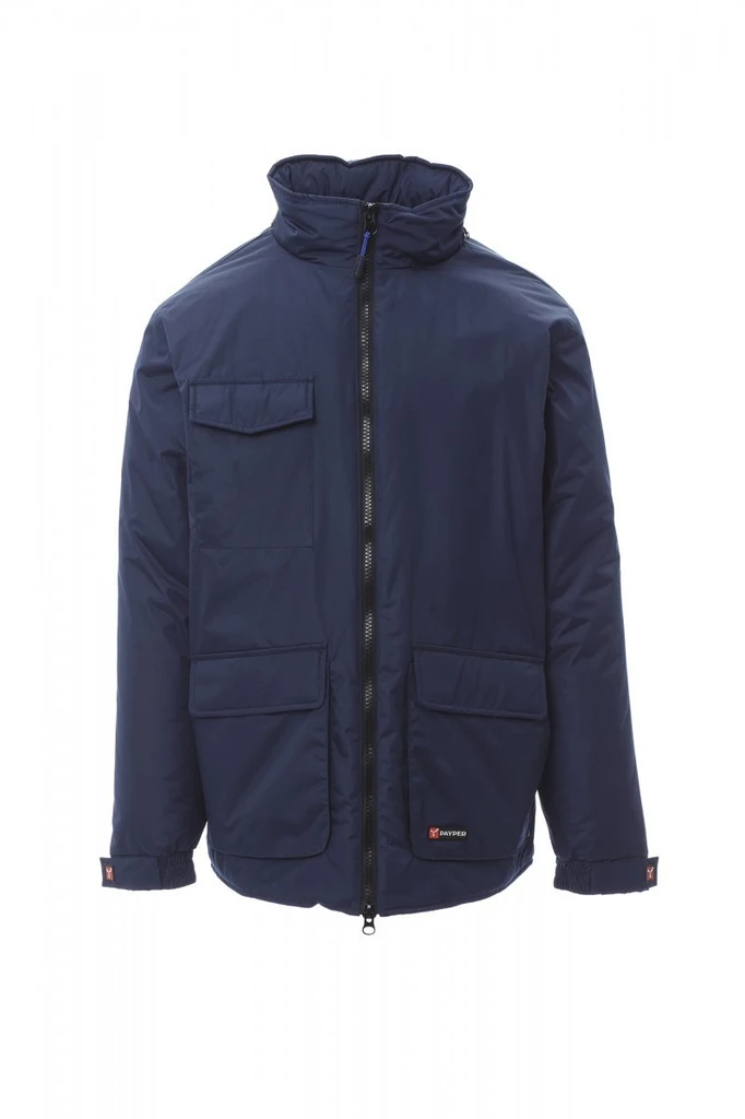 3/4 length men's jacket, 8 mm plastic zip with metal pull, foldaway hood, elastic and adjustable wrist fastening, two roomy LOCK SYSTEM front pockets, two side pockets, smartphone holder breast pocket. Inside: padded, zip for easier printing and embroidery