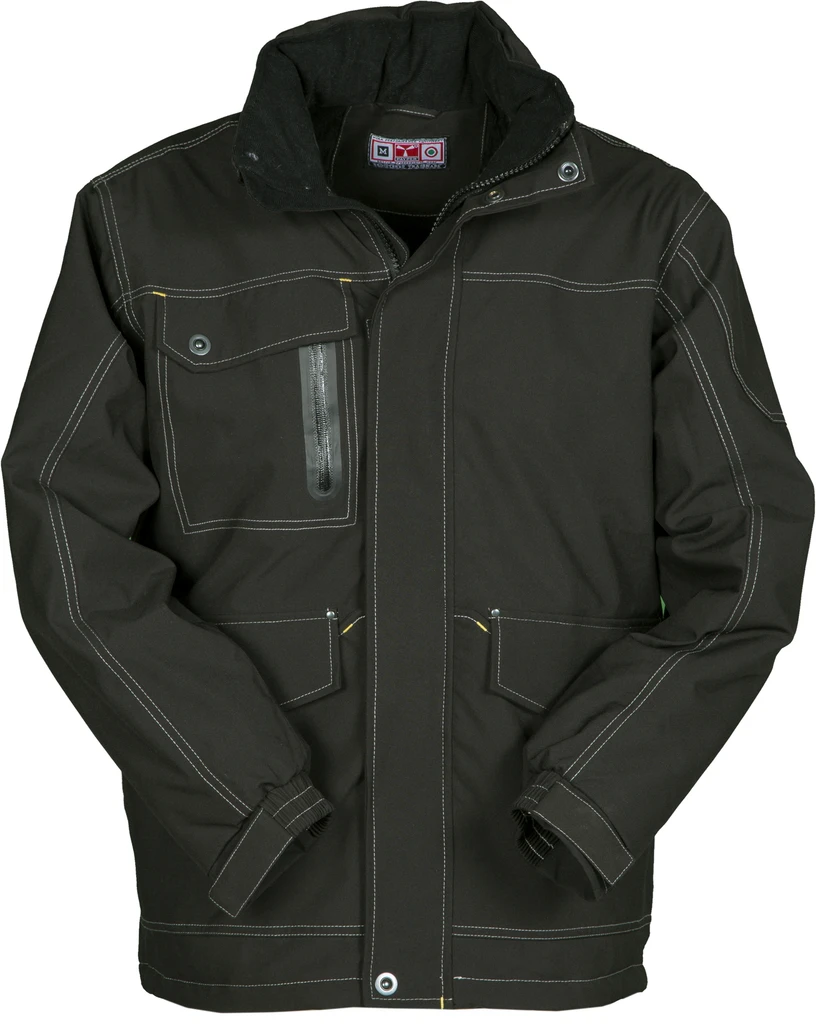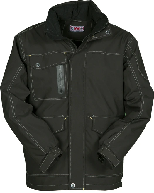 Men’s jacket in technical breathable stretch fabric, 8 mm plastic zip and Velcro front fastening, heat-welded seams, foldaway shaped hood, adjustable cuffs, four roomy front pockets, two with flap and zip, two breast pockets with taped zip, metal snap fasteners, silver/grey contrast stitching. Padded, polyester fleece lining