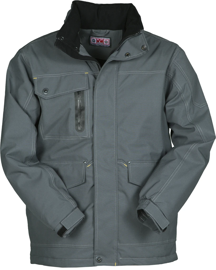 Men’s jacket in technical breathable stretch fabric, 8 mm plastic zip and Velcro front fastening, heat-welded seams, foldaway shaped hood, adjustable cuffs, four roomy front pockets, two with flap and zip, two breast pockets with taped zip, metal snap fasteners, silver/grey contrast stitching. Padded, polyester fleece lining
