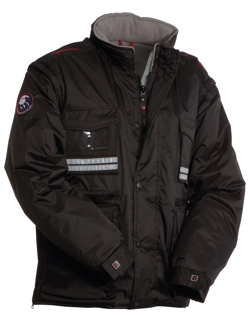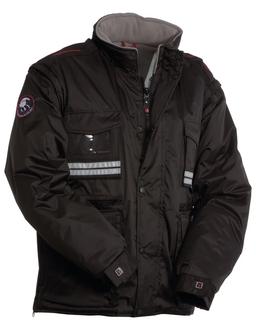 Men’s jacket with detachable sleeves, 8 mm plastic zip with metal pull, with flap fastening and plastic buttons, detachable and/or foldaway shaped hood, adjustable cuffs, grey reflective stripes on the front and back, pre-shaped elbows and side vent with gusset and zip, nine outer pockets, two with LOCK SYSTEM, two with zip and reinforced inner, one with a reversible badge holder. Padded, micro-fleece inside collar, back and lower back warmer, breathable underarm inserts, inner drawstring and zip for easier printing and embroidery