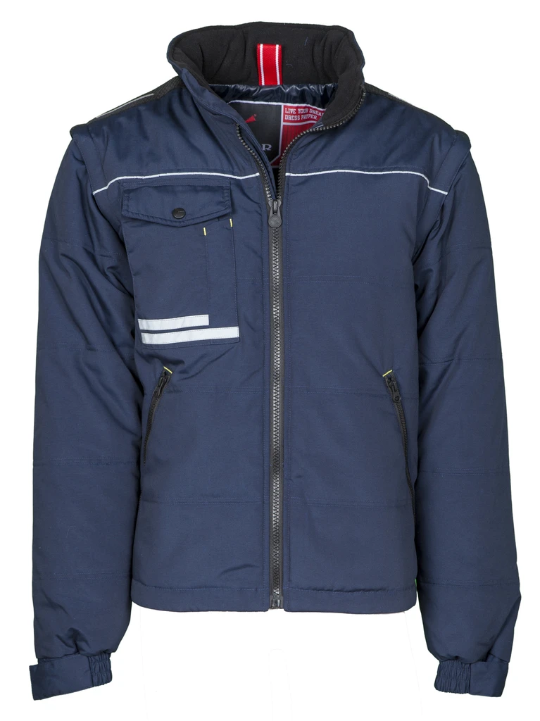 Men’s lightweight jacket with detachable sleeves, contoured back, 8 mm plastic zip with metal pull, two roomy outer pockets with zip, roomy multifunctional breast pocket for smartphone with reflective stripes, badge holder ring. Padded, high-density lining, inner fleece collar, one inner pocket