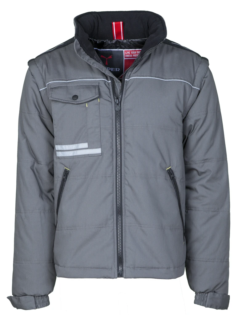 Men’s lightweight jacket with detachable sleeves, contoured back, 8 mm plastic zip with metal pull, two roomy outer pockets with zip, roomy multifunctional breast pocket for smartphone with reflective stripes, badge holder ring. Padded, high-density lining, inner fleece collar, one inner pocket