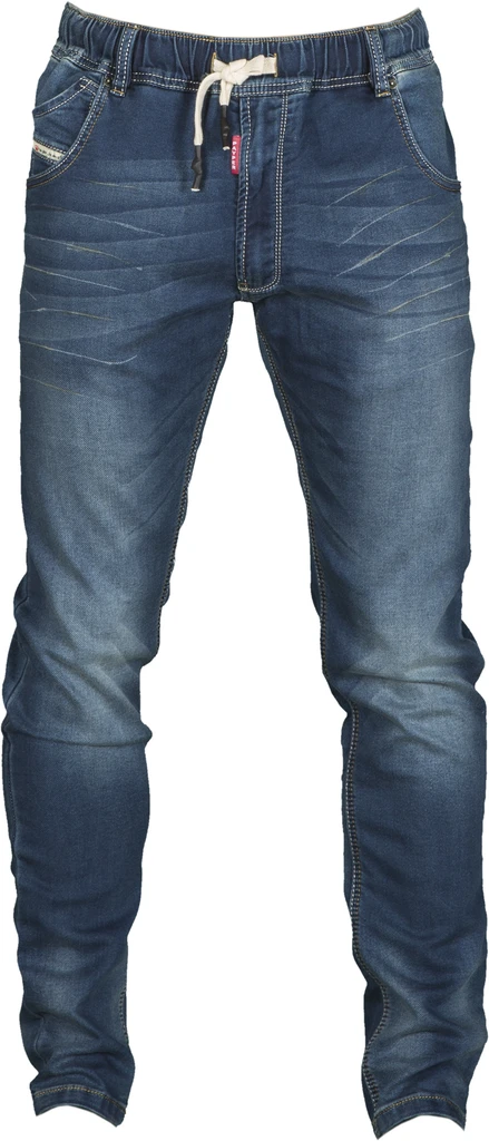 Men’s all-season jeans with five pockets, elasticated, drawstring waist with belt loops, metal zip fastening, worn effect, heavy duty stitching, double seams on inside leg, slim leg, studs and patches in real leather