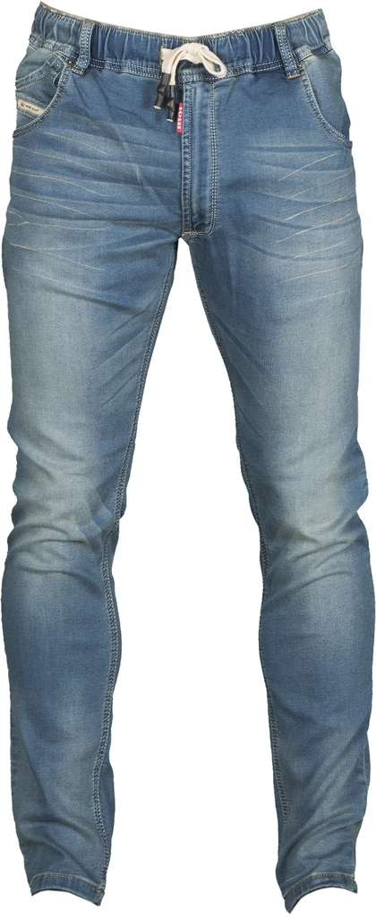 Men’s all-season jeans with five pockets, elasticated, drawstring waist with belt loops, metal zip fastening, worn effect, heavy duty stitching, double seams on inside leg, slim leg, studs and patches in real leather