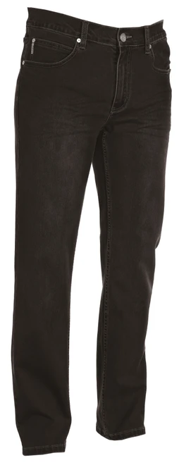 Men’s jeans with five pockets, metal zip fastening with button, belt loops at waist, stone wash, worn, faded effect, contrasting heavy duty stitching, double seams on inside leg, straight leg, studs and patches in real leather