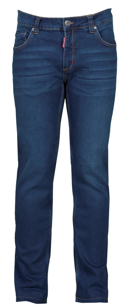 Men’s jeans with five pockets, one foldaway tape measure pocket, one pen and cutter holder, metal zip fastening with button, belt loops at waist, stone washed treatment, worn and faded effect; straight leg, contrasting heavy duty stitching, triple seams inside leg