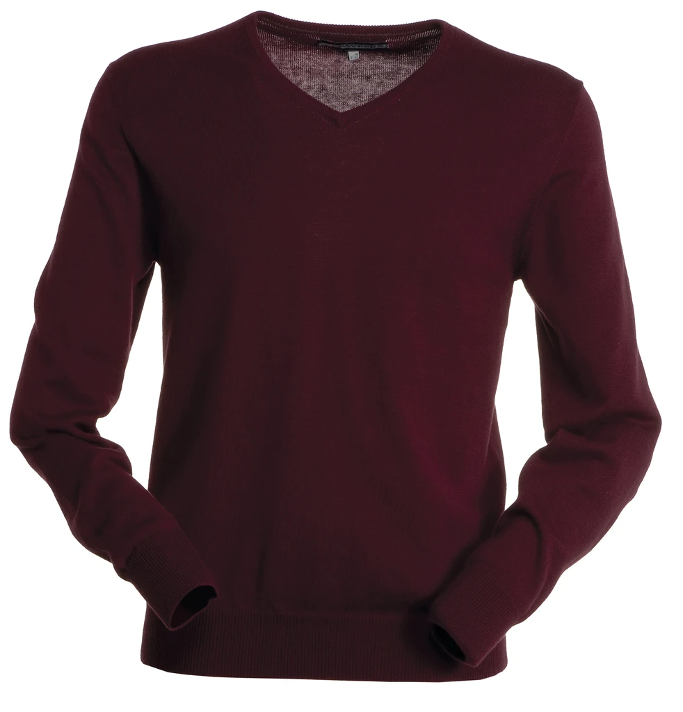 Men’s V neck jumper with fine rib collar, cuffs and hem, in stocking stitch and fully fashioned without seams