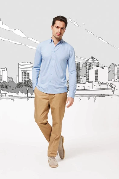 150gsm (White: 145gsm) • 58% Mercerised Cotton 42% Poly Schreiner Jersey (Body) • button down collar • twin pleat back • mitred cuff, 2 buttons