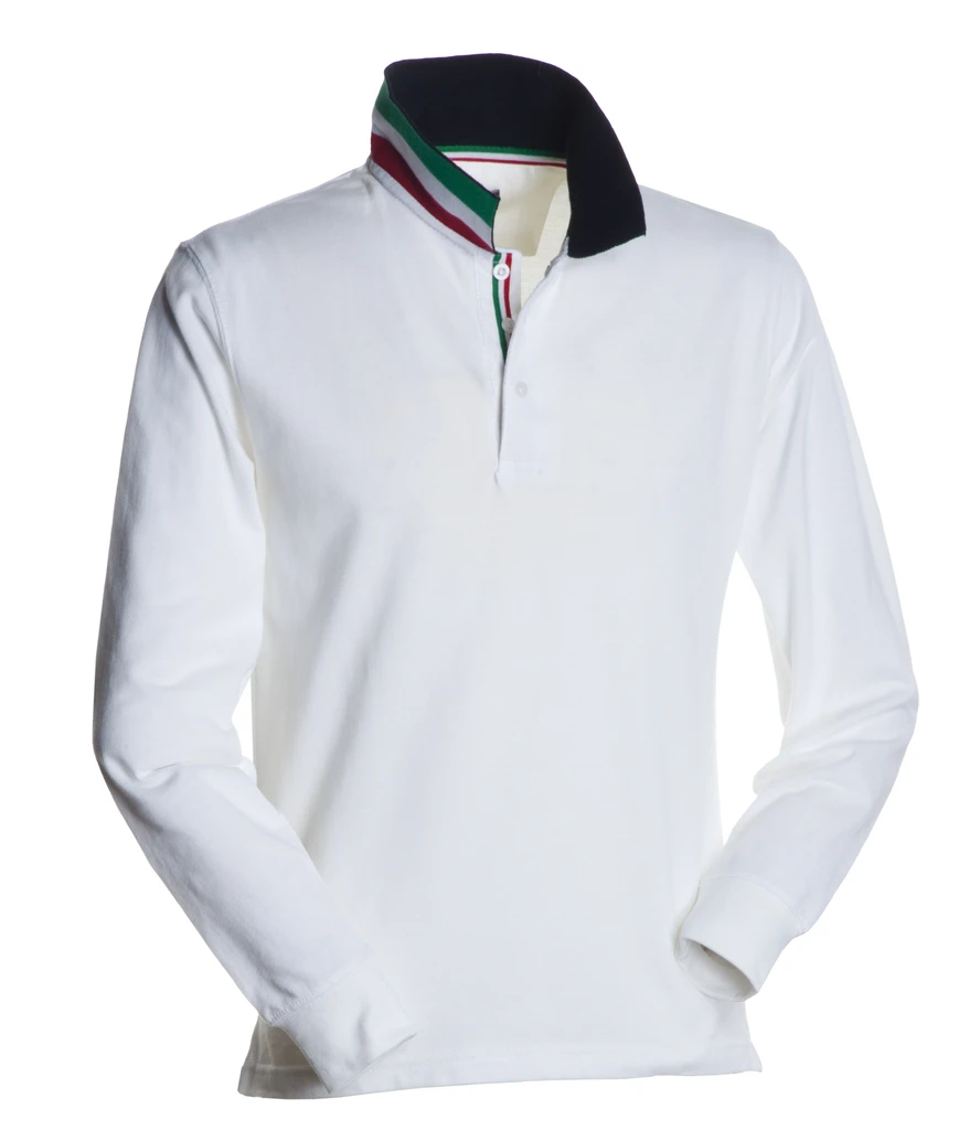 Men’s long-sleeved polo shirt with 3, matching, mother-of-pearl effect buttons, matching collar, with contrasting underside (colours of the flag). Inner button flap and side vents with colours of the flag, rib collar and sleeve edging, concealed collar stitching, side reinforcement tape, inner neck tape