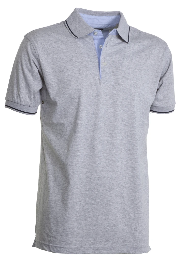 Men’s short-sleeved polo shirt with 3 white buttons, inside collar, flap and side vents in Oxford blue, rib collar and sleeve edging with fine contrasting trim, underarm eyelets, side vents with reinforced seams, side reinforcement tape, stretch seams, inner neck tape