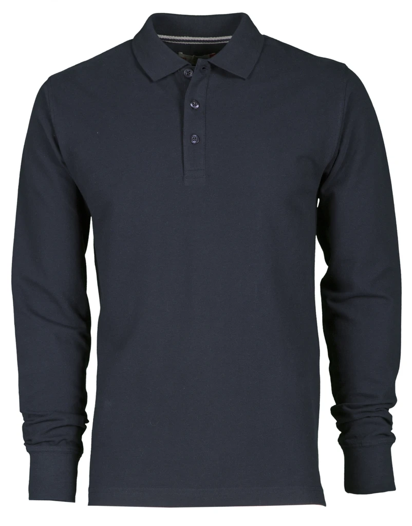 Men's long-sleeved polo shirt with 3, matching, mother-of-pearl effect buttons, rib collar and cuffs, side vents, concealed collar stitching with contrasting tape, stretch seams, side reinforcement tape, inner neck tape